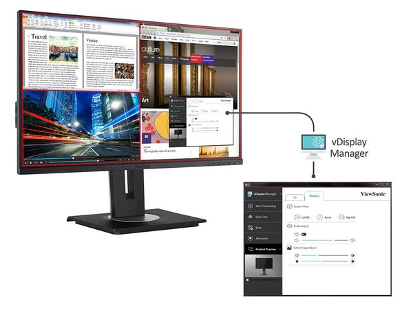 Phần mềm vDisplay Manager độc quyền của ViewSonic được cung cấp miễn phí và cho phép người dùng tổ chức và chia màn hình của họ thành nhiều phần. Phần mềm cũng cho phép người dùng điều chỉnh cài đặt màn hình của họ trực tiếp thông qua phần mềm để có quy trình làm việc hiệu quả hơn.