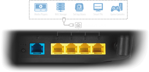 RT-AC59U được trang bị bốn cổng Gigabit LAN hỗ trợ đồng thời tốc độ lên tới 4Gbps. TV thông minh, bộ điều khiển game, hộp cáp, trình phát đa phương tiện, thiết bị lưu trữ NAS và nhiều thiết bị khác hiện nay có thể có cổng chuyên dụng để biến RT-AC59U thành hub đa phương tiện không giật ngay tại nhà của bạn.