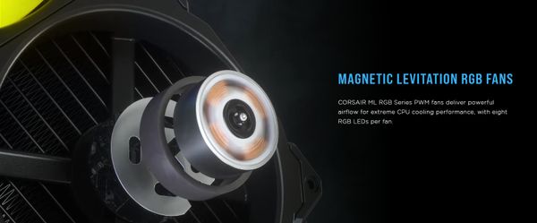 Quạt RGB Corsair ML với 8 bóng led mỗi quạt cho hiệu ứng ánh sáng sống động. Phiên bản quạt với trục cân bằng nam châm hoạt động bền bỉ