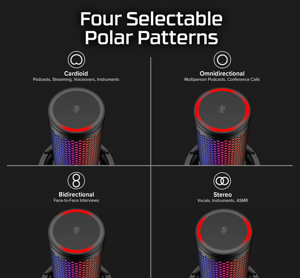Tối đa hóa việc thu âm bằng cách chọn tính định hướng (Đơn hướng; Đa hướng; Song hướng; Âm nổi) của QuadCast 2 S linh hoạt phù hợp nhất với nhu cầu thu âm thanh của bạn.
