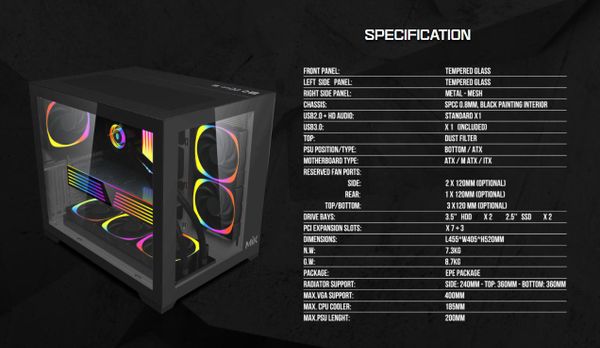 - Hỗ trợ VGA 400mm, tản nhiệt CPU 185mm, khe dựng card VGA 3 slot